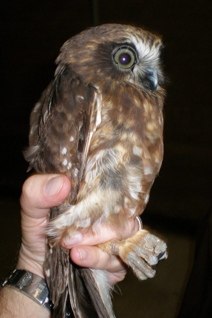 Despite being our smallest owl, those talons are sharp and powerful. Many dangerous birds are banded with two people doing the job, or, as pictured below, leaving the bird in the bag and extracting a leg. Of course, I checked both legs for bands first!