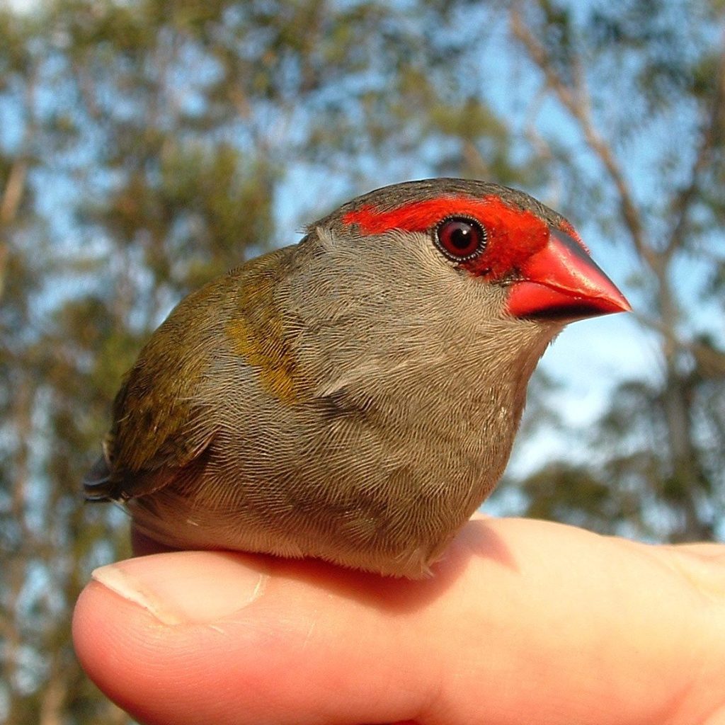 Below, the ubiquitous, yet utterly charming Red-browed Finch.