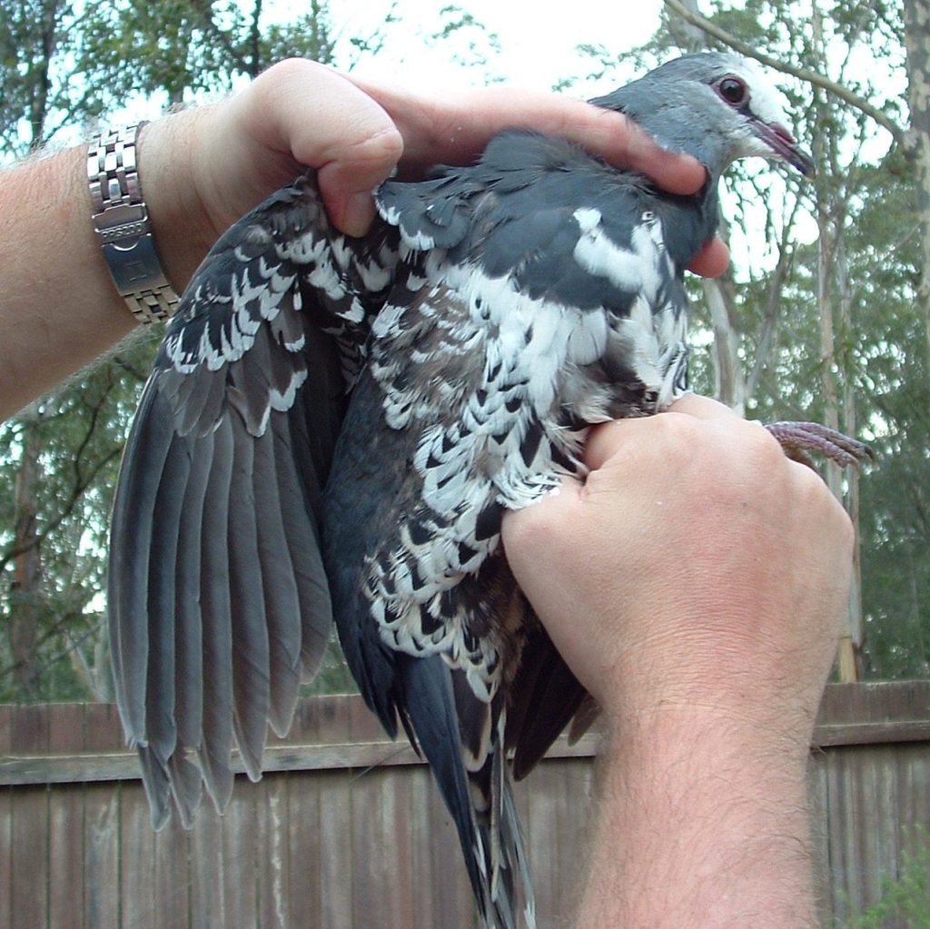 Below, a Wonga Pigeon. A huge chunk of a pigeon, almost like holding a football, and yes, I have a very firm grip on this bird’s legs. I’m holding the wing open to show the wonderful speckled pattern on the underwing and undertail coverts and the flank. It still amazes me that this strong, powerful flyer would much prefer to walk everywhere!