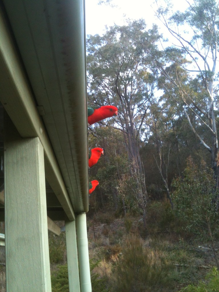 Michael and Sarah put out a little bit of food for some of the local birds. Below, the resident male Australian King Parrots have been keenly awaiting the return of the humans on the off chance some seed might be forthcoming.