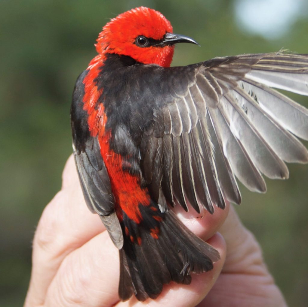 How do you catch birds?? I’m glad you asked. We catch birds in a fine nylon mesh net called a mist net, which is strung up between two poles. The fine mesh is not immediately visible against the background vegetation, so the majority of birds fly into the net and are caught.