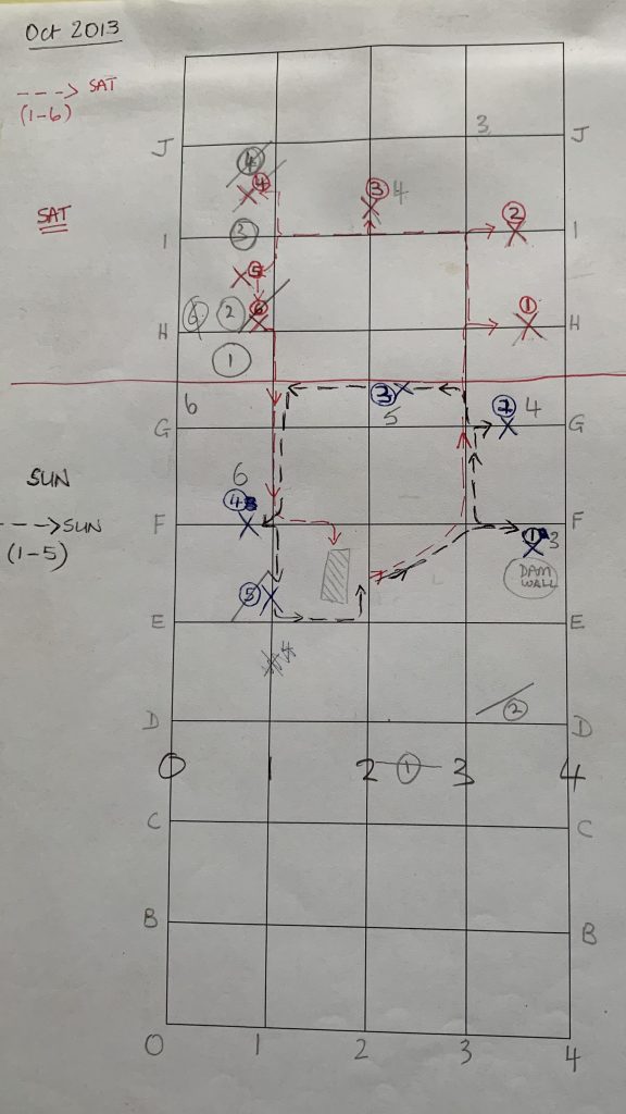 Below is a diagram of the site (50 metre grid squares), with Saturday details marked in red, Sunday in black. Net sites (X) are numbered on the on the net round path (- – -). Net sites are officially labelled with the nearest trail intersection letter-number designation. The hatched rectangle in pencil near E2 is the very small clearing where we set up the banding station. From memory, the weekend plan depicted below was a smaller operation, with a small crew. A larger crew would see a dozen or more nets operating.