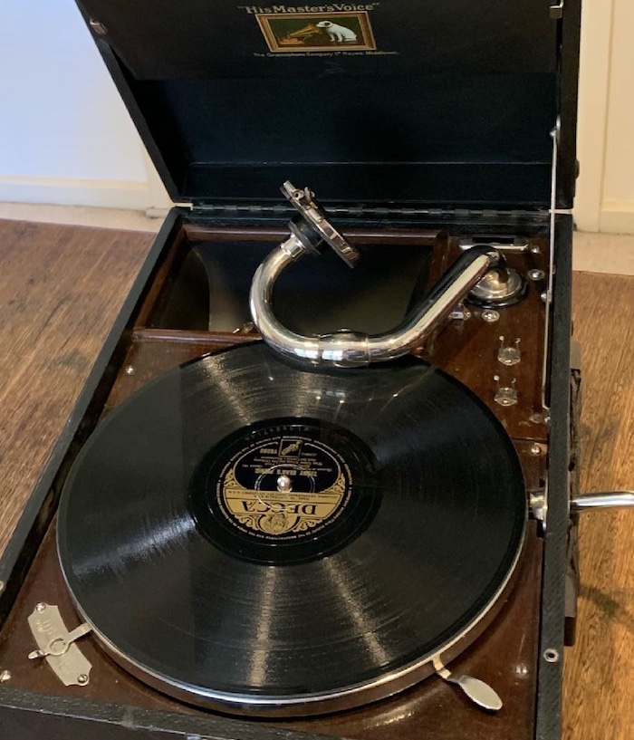 It’s a travel gramophone made by His Masters Voice. The tone arm folds back and is clamped into the sound hole. The crank handle fits into the clamps underneath the tone arm. Records fit in the slot in the lid. The gramophone belonged to my great grandfather. He took it apart to restore it, and it subsequently sat in pieces for many years. It was passed down to my dad, and my parents had it restored. I inherited it on my dad’s passing eight years ago. It’s a treasured object!