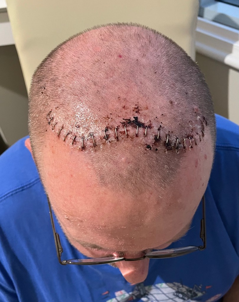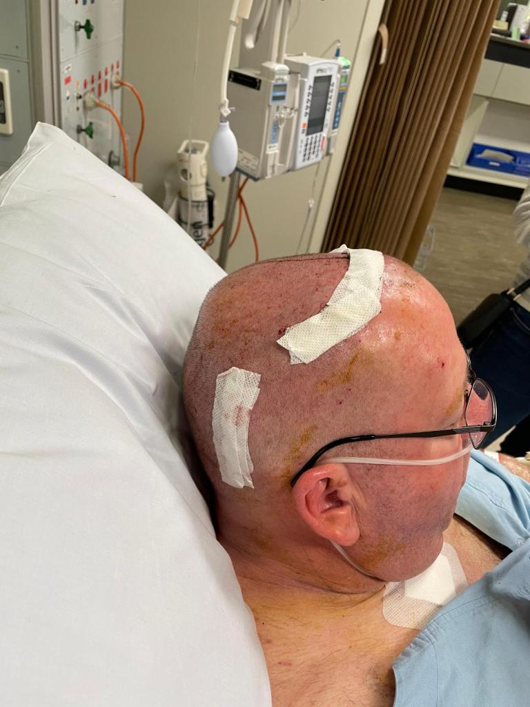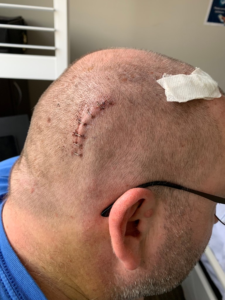 Fully stapled and bandaged, it was time for the frame to come off. Once again, I remained awake and experienced the unusual sound of the pins being unscrewed from my skull. I likened it to removing wheel nuts that have been on a car too long and too tight. You know, that horrible metal-on-metal squeaky sound. Again, I did not feel a thing, but the sound was incredible!